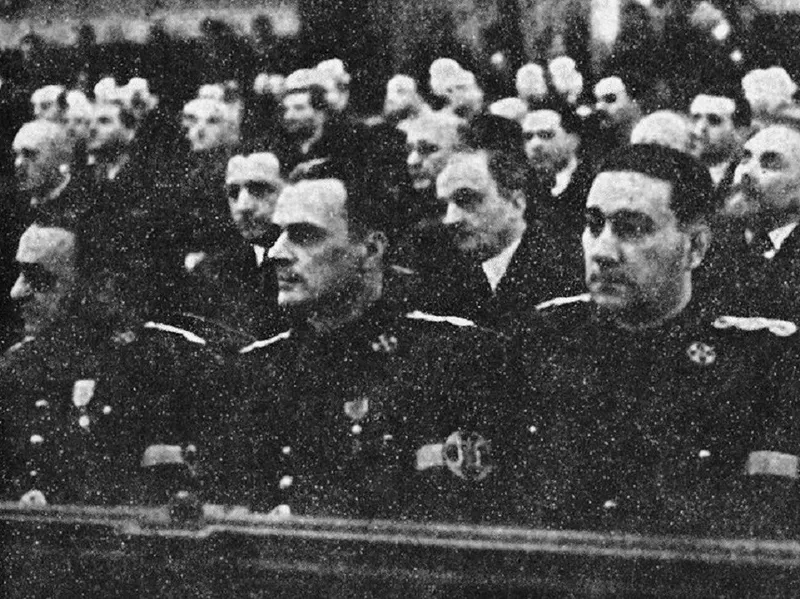 Mihai Ralea (primul din dreapta), ministrul Muncii în 1939, în uniforma partidului unic din perioada dictaturii lui Carol al II-lea, Frontul Renașterii Naționale, a fost organizatorul mitingului de la 1 mai 1939 - Foto: arhiva
