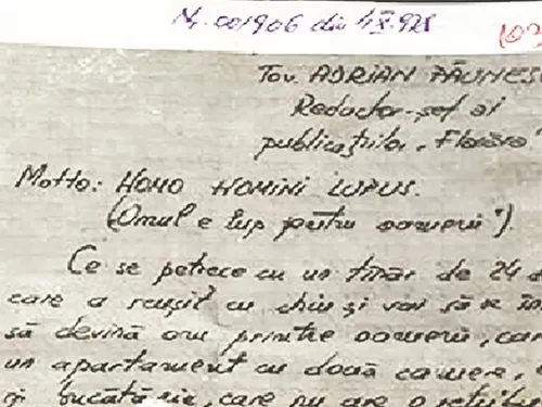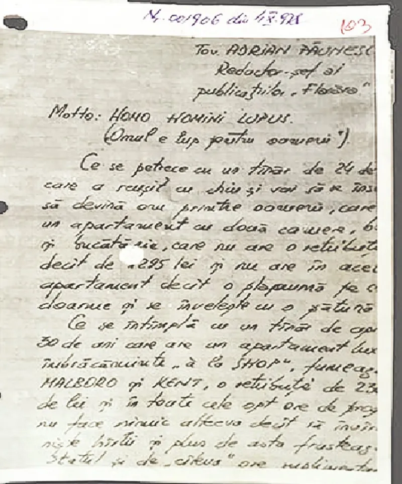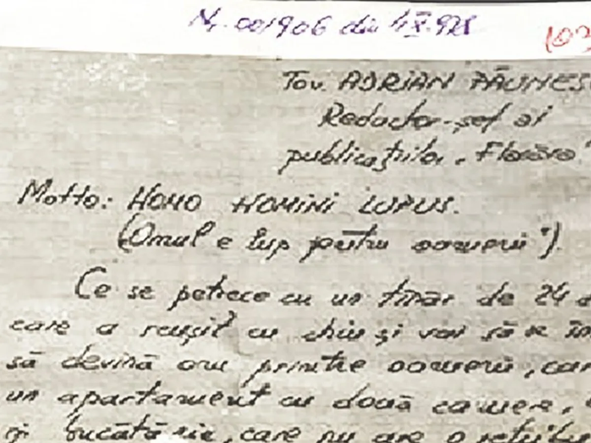 Cu un an înainte ca Securitatea să îi deschidă dosarul, tânărul C.I., disperat din cauza sărăciei, a trimis, în octombrie 1978, o scrisoare pe adresa Revistei „Flacăra“, către redactorul-șef Adrian Păunescu.