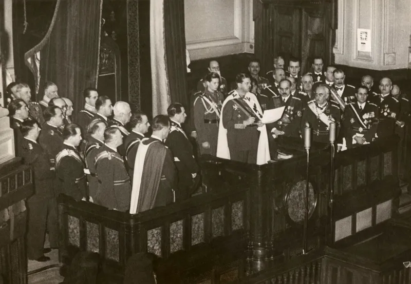 Regele Carol al II-lea, cu fiul său, Mihai, în spate, vorbind la deschiderea lucrărilor Parlamentului în martie 1940 - Foto: Profimedia Images