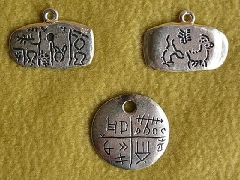 Două dintre ele sunt găurite și sunt acoperite cu semne, iar a treia folosește o modalitate de scris pur pictografică, respectiv reprezentarea stilizată a unui animal (capră), un simbol vegetal și un altul neclar. Cea de formă discoidală, cuprinde patru grupuri de semne, despărțite prin linii.