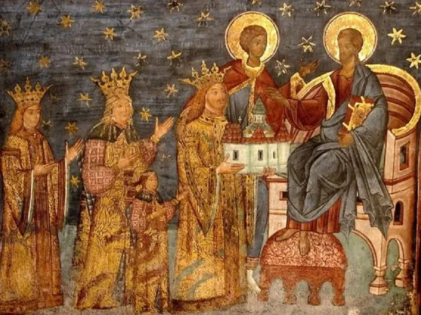 Toți trei poartă coroane pe cap, aceeași imagine a domnului găsindu-se și în reprezentarea de la mănăstirea Dubrovăț, la cea din Pătrăuți, precum și în cunocutul Evangheliar de la Humor.