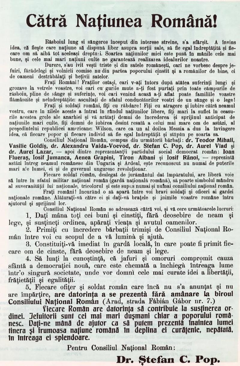 „Este un moment solemn! Președintele Adunării Naționale, George Pop de Băsești, se ridică și întreabă dacă Adunarea Națională primește proiectul de Rezoluțiune prezentat de Vasile Goldiș. Urmează aprobări entuziaste și însuflețite, aclamații îndelungate. În continuare, Președintele proclamă: