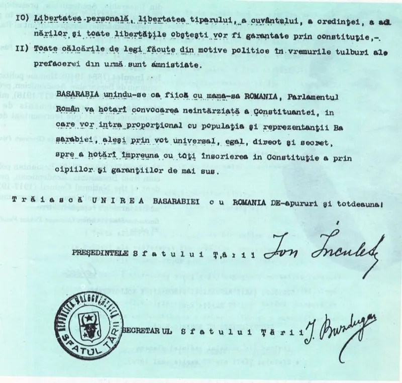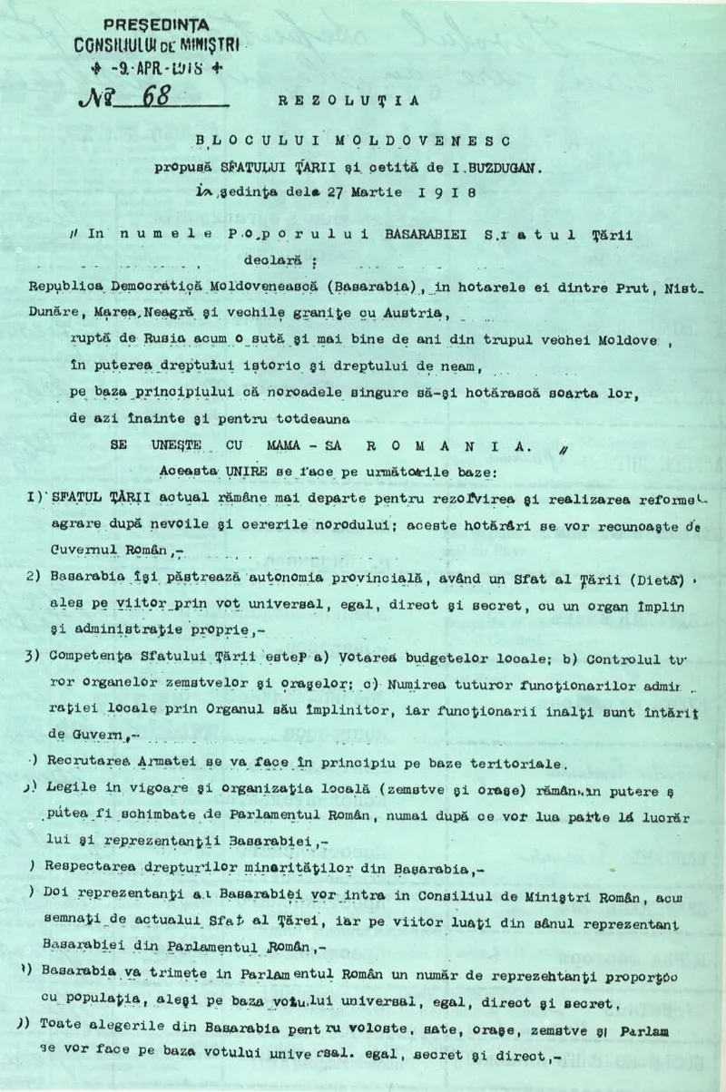 Unirea Basarabiei cu România, la 27 martie/9 aprilie 1918: