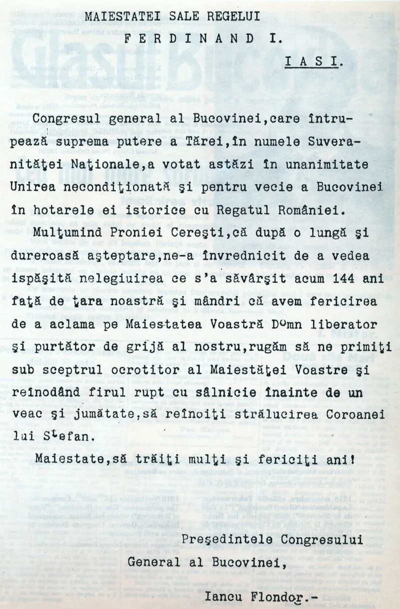 Unirea Bucovinei cu România, la 15/28 noiembrie 1918: