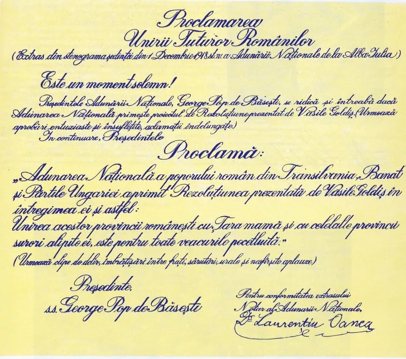 „Adunarea Națională a poporului român din Transilvania, Banat și Părțile Ungariei a primit Rezoluțiunea prezentată de Vasile Goldiș în întregimea ei și astfel: Unirea acestor provincii românești cu Țara mamă și cu celelalte provincii surori alipite ei este pentru toate veacurile pecetluită”, se arată într-un fragment din stenograma ședinței din 1 decembrie 1918 a Adunării Naționale de la Alba Iulia, publicată de Arhivele Diplomatice ale Ministerului de Externe.
