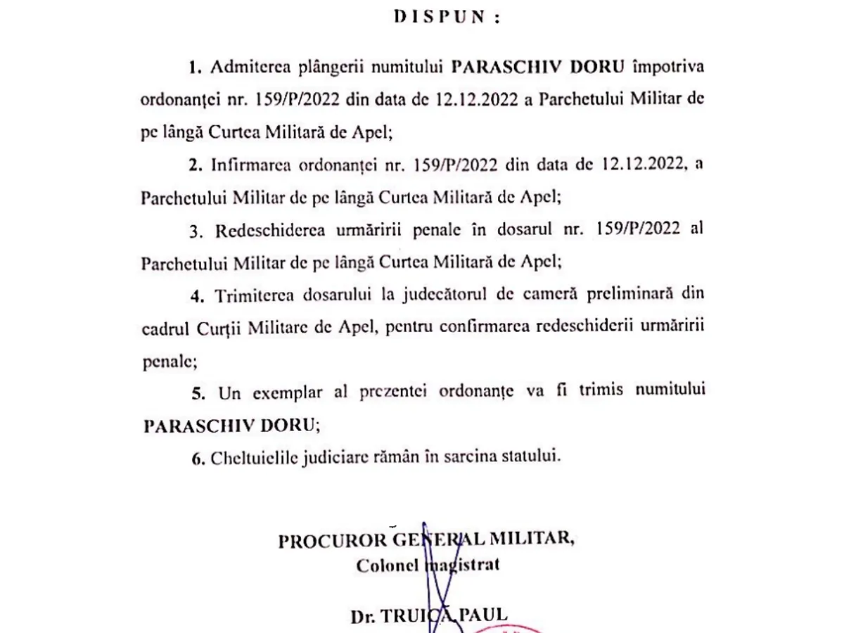 Conducerea Parchetului de pe lângă Curtea Militară a dat câștig de cauză col. Paraschiv, arătând că soluția de clasare „nu este temeinică și legală” și că urmărirea penală a fost una deficitară.