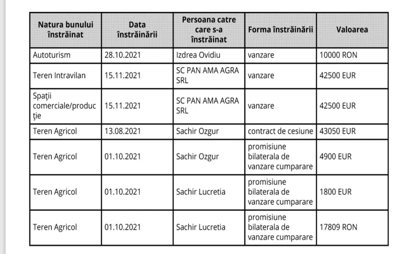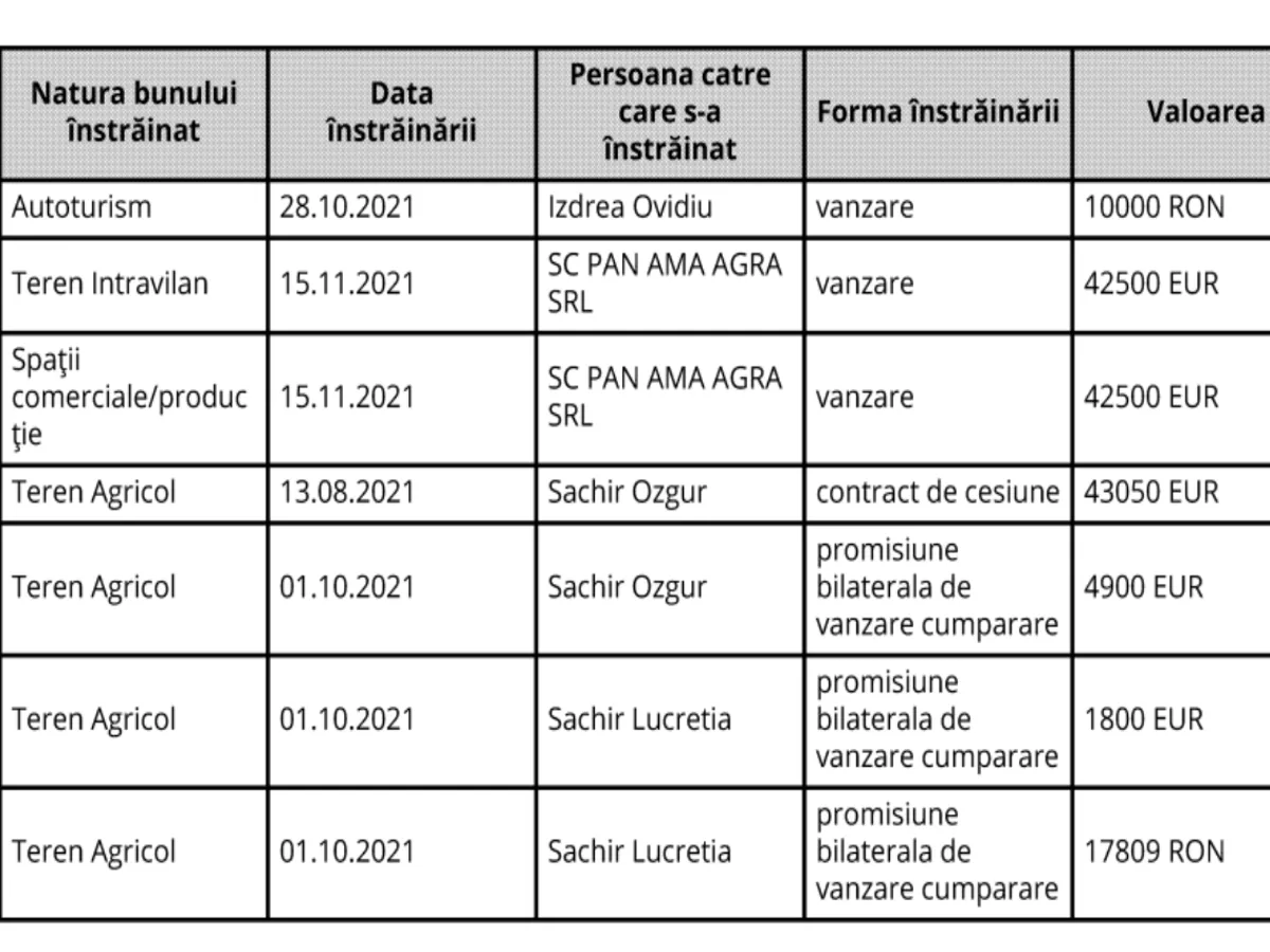Anul trecut a vândut 4 terenuri agricole, un autoturism, un teren intravilan și un spațiu comercial în valoare de 135.000 de euro.
