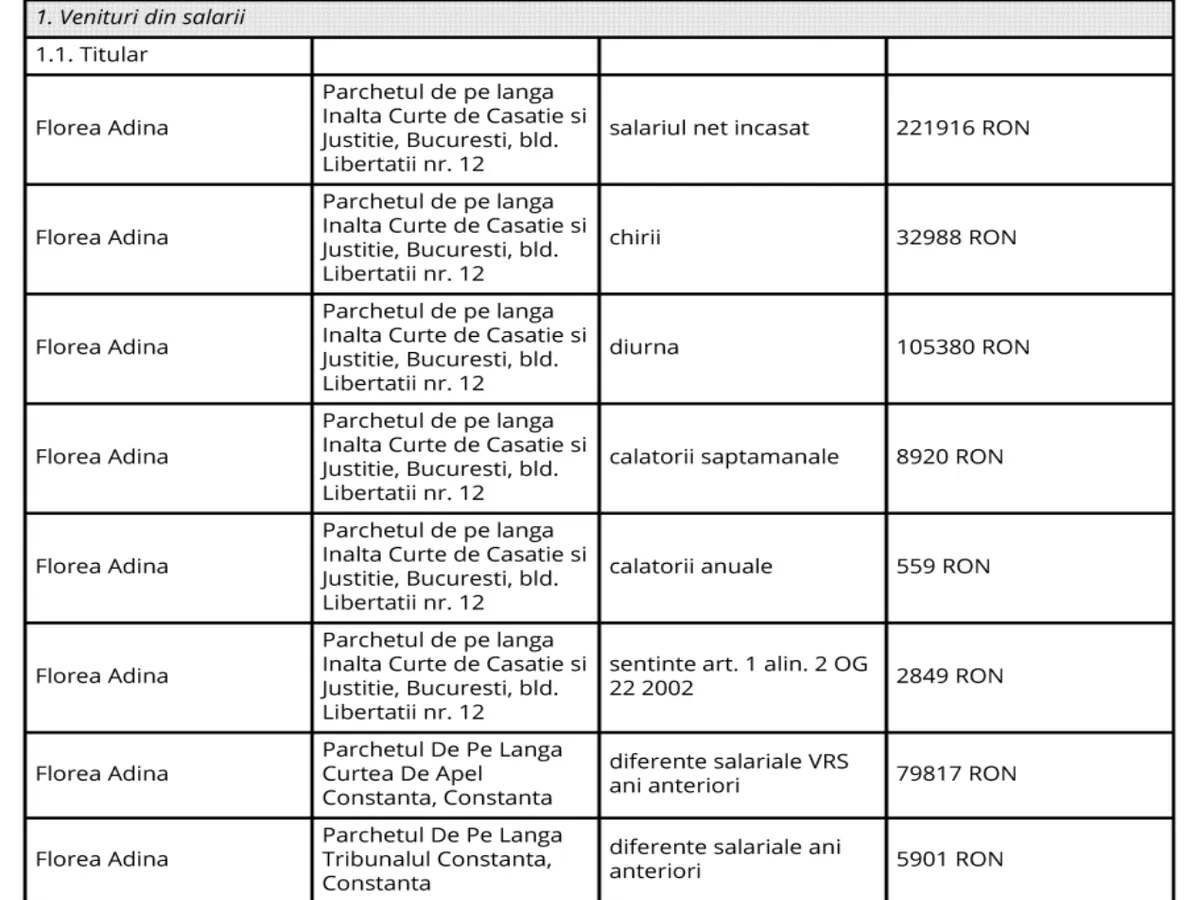 Adina Florea a avut opt venituri în anul 2021, în valoare de 458.330 de lei, adică 7.600 euro pe lună.