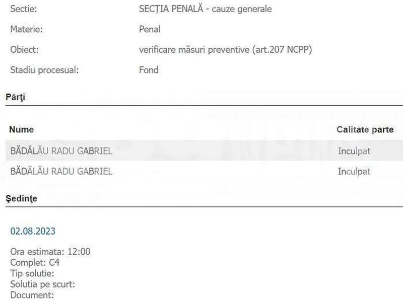„În baza art. 215 alin. 9 C.p.p. respinge cererea inculpatului BĂDĂLĂU RADU GABRIEL de modificare obligaţii control judiciar, în sensul de a i se permite părăsirea teritoriului României în perioada 13.06 – 17.06.2023, în vederea deplăsării în Turcia, oraşul Istanbul. Definitivă”, a decis, luna trecută, instanța.