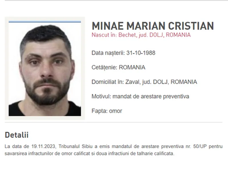 Acesta avea emis pe numele lui, de către Tribunalul Sibiu, un mandat de arestare preventivă. Bărbatul a fost identificat în urma schimbului de informaţii realizat de poliţişti din cadrul Centrului de Cooperare Poliţienească Internaţională - IGPR cu partenerii din Regatul Unit al Marii Britanii şi Irlandei de Nord.