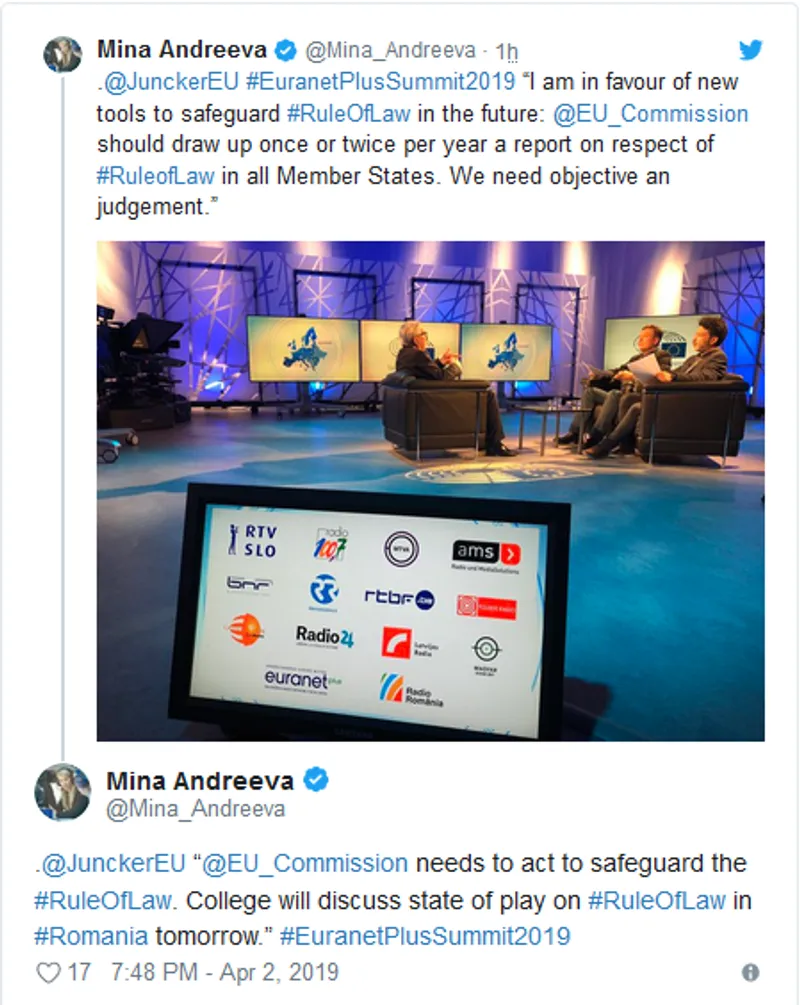 O purtătoare de cuvânt a Comisiei, Mina Andreeva a scris pe Twitter: „Comisia Europeană trebuie să acționeze pentru a salva statul de drept. Colegiul Comisarilor va discuta mâine starea statului de drept în România”.