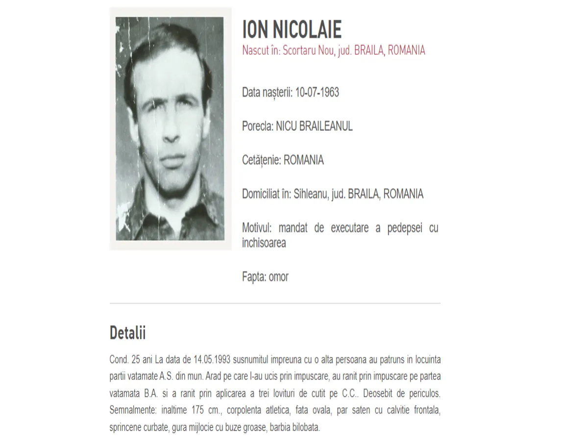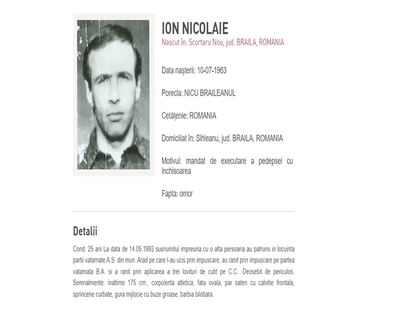 Un criminal român este căutat de mai bine de 30 de ani prin toată lumea pentru a ispăși o condamnare de 25 de ani. Anunțul privind semnalmentele criminalului se află și acum pe site-ul Poliției Române la secțiunea „most wanted”.