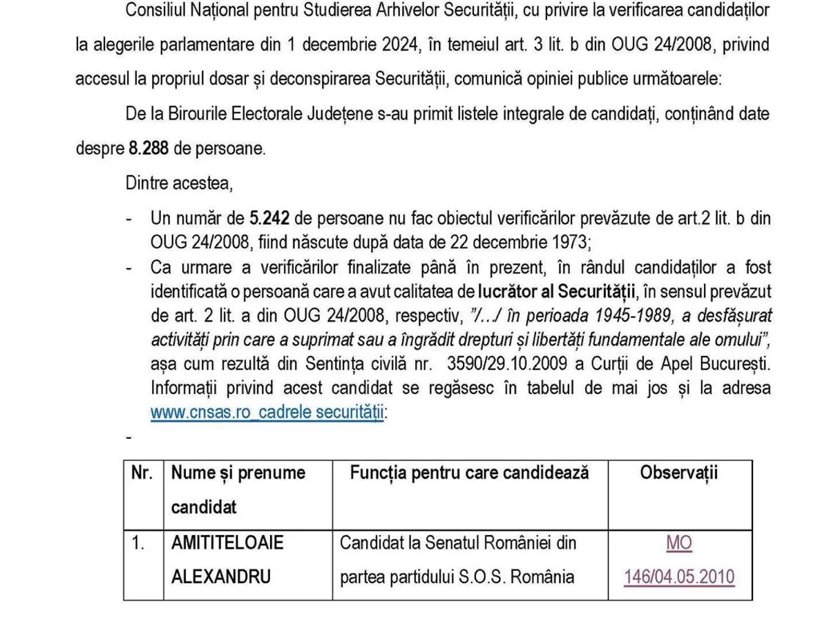 Un număr de 5.242 de persoane nu fac obiectul verificărilor prevăzute de art.2 lit. b din OUG 24/2008, fiind născute după data de 22 decembrie 1973. Ca urmare a verificărilor finalizate până în prezent, în rândul candidaților a fost