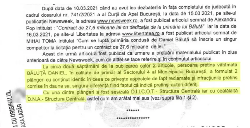 DIICOT recunoaște că primarul Daniel Băluță „nu a indicat în concret vreo minimă conexiune” împotriva ziariștilor Newsweek România și Libertatea și a clasat dosarul.