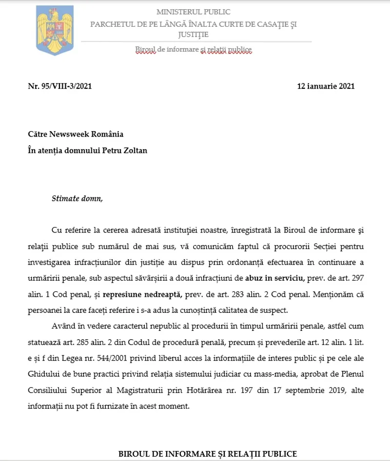 La solicitarea Newsweek România, Biroul de Presă al Ministerului Public a transmis că „procurorii Secției pentru investigarea infracțiunilor din justiție au dispus prin ordonanță efectuarea în continuare a urmăririi penale, sub aspectul săvârșirii a două infracțiuni de abuz in serviciu, prev. de art. 297 alin. 1 Cod penal, și represiune nedreaptă, prev. de art. 283 alin. 2 Cod penal. Menționăm că persoanei la care faceți referire i s-a adus la cunoștință calitatea de suspect”.