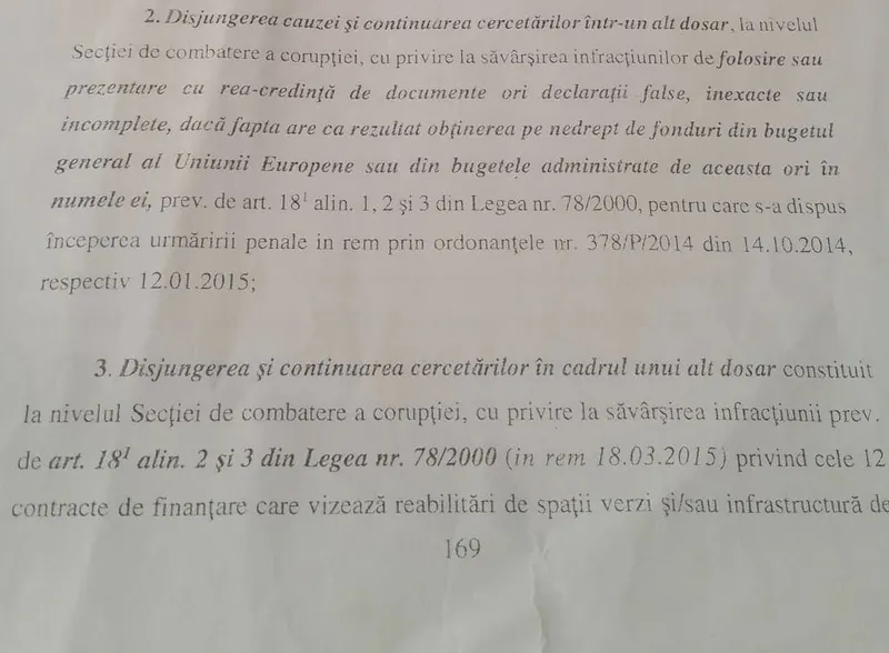 2. Disjungerea cauzei și continuarea cercetării într-un alt dosar, la nivelul Secției de combatere a corupției,.. cu privire la cele 12 contracte de finanțare care vizează reabilitări de spații verzi și/sau infrastructură de acces...