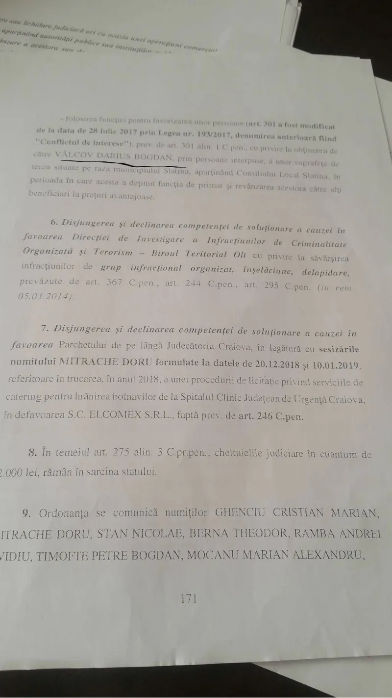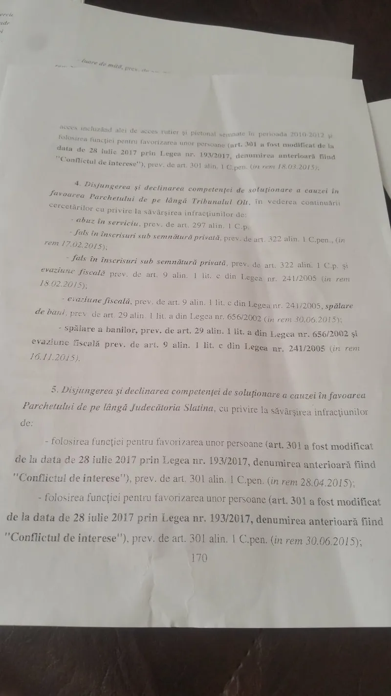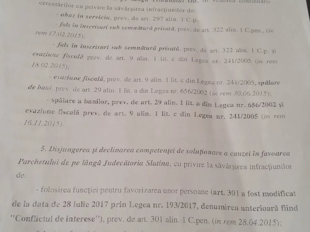 4. Disjungerea și declinarea competenței de soluțioare a cauzei în favoarea Parchetului de pe lângă Judecătoria Slatina cu privire la săvârșirea infracțiunilor de folosire a funcției pentru favorizarea unor persoane... cuprivire la obținerea de către Darius Vâlcov, prin persoane interpuse, a unor suprafețe de teren situate pe raza municpiului Slatina, aparținând Consiliului Local Slatina în perioada în care acesta a deținut funcția de primar și beneficiind de vânzarea acestuia către alți beneficiind de prețuri avantajoase.