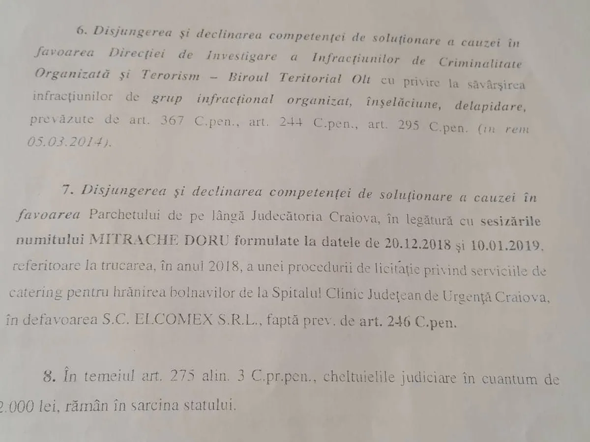 5 . Disjungerea și declinarea competenței de soluționare a cauzei în favoarea Direcției de Investigare a Infracțiunilor de Criminalitate Organizată și Teorism cu privire la săvârșirea infracțiunii de grup infracțional organizat, înșelăciune, delapidare”, arată DNA.