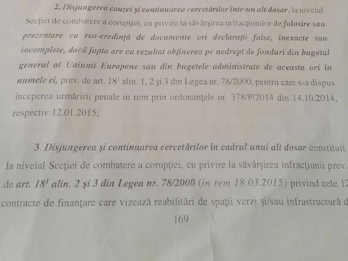 „... 1. Disjungerea cauzei și continuarea cercetării într-un alt dosar, la nivelul Secției de combatere a corupției, cu privire la săvârșirea infracțiunilor de folosire sau prezentare cu rea credință de documente ori declarații false, inexacte sau incomplete, dacă fapta are ca rezultat obținerea pe nedrept de fonduri din bugetul Uniunii Europene...