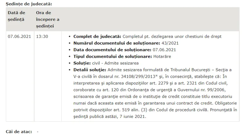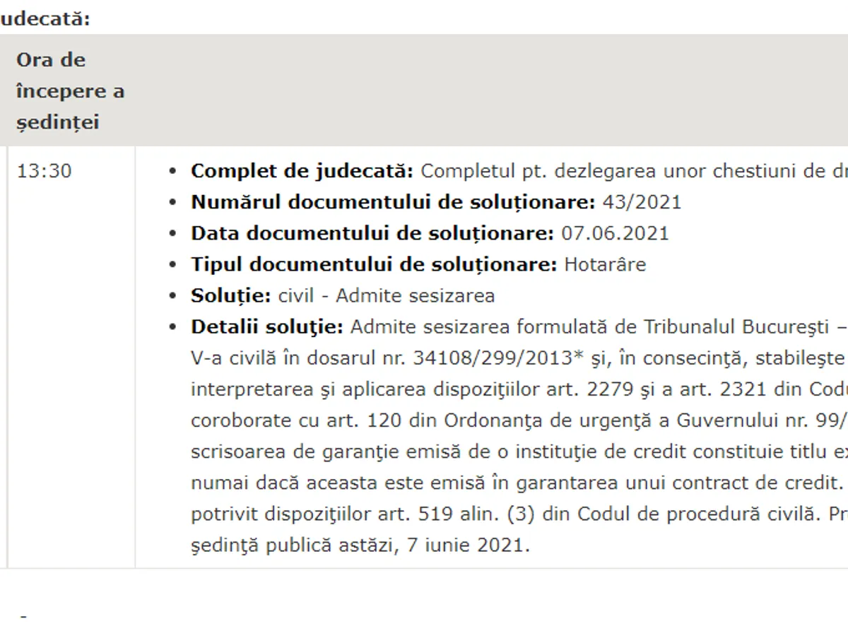Completul pentru dezlegarea unor chestiuni de drept de la Înalta Curte de Casație și Justiție (ICCJ) a decis în cursul zilei de luni, 7 iunie 2021, că „în interpretarea şi aplicarea dispoziţiilor art. 2279 şi a art. 2321 din Codul civil, coroborate cu art. 120 din Ordonanţa de urgenţă a Guvernului nr. 99/2006, scrisoarea de garanţie emisă de o instituţie de credit constituie titlu executoriu numai dacă aceasta este emisă în garantarea unui contract de credit. Obligatorie potrivit dispoziţiilor art. 519 alin. (3) din Codul de procedură civilă”.