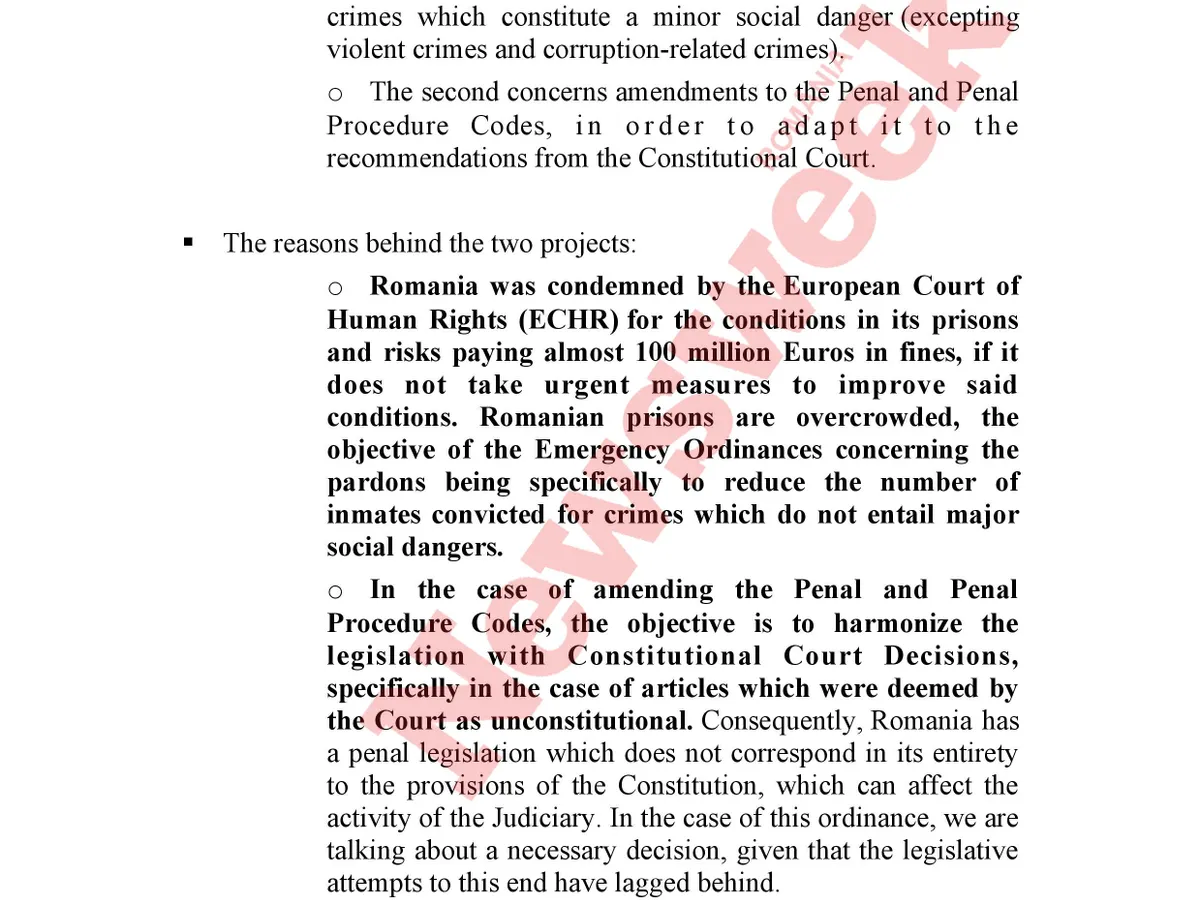 România a fost condamnată de către Curtea Europeană a Drepturilor Omului pentru condițiile din închisori și riscă să plătească despăgubiri de 100 de milioane de euro dacă nu îmbunătățește situația din detenție. Închisorile românești sunt supra-aglomerate, iar scopul OUG referitoare la aministie este tocmai să reducă numărul acelor deținuți condamnați pentru fapte care nu prezintă pericol social major.