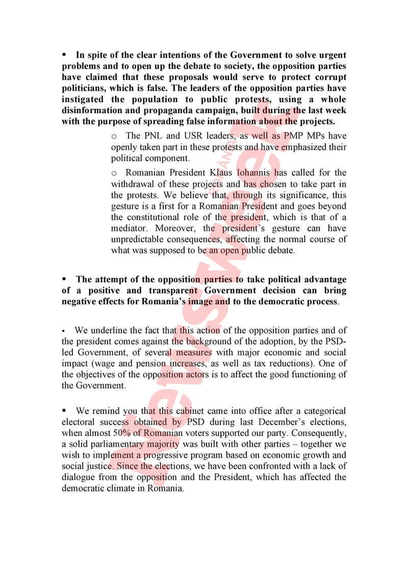 Subliniem că aceste acțiuni ale opoziției și ale președintelui se opun și adoptării de către guvernul PSD a unor măsuri cu impact economic și social major (creșteri ale salariilor și pensiilor, scăderi de taxe). Unul din obiectivele actorilor politici din opoziție este să afecteze buna funcționare a Executivului.
