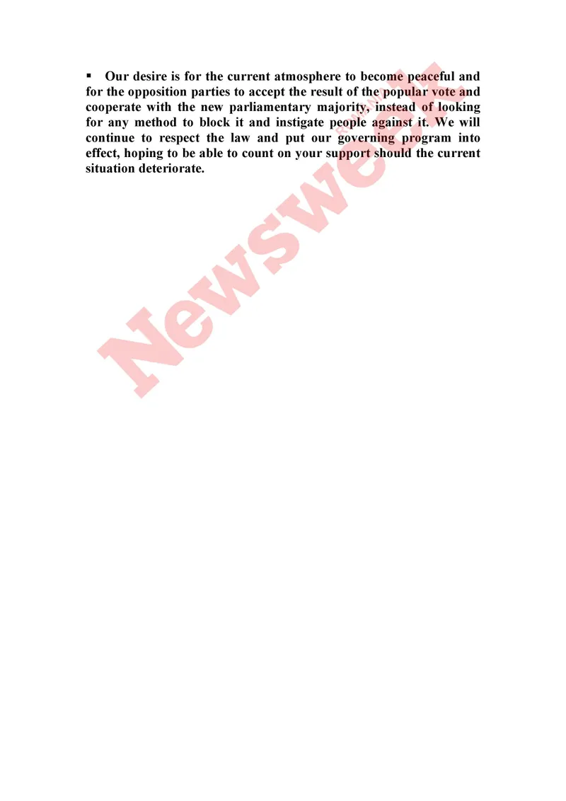 Dorința noastră este ca actuala situație să devină liniștită, partidele de opoziție să accepte rezultatul votului popular și să coopereze cu noua majoritate parlamentară în loc să încerce prin orice metodă să o blocheze și să instige cetățenii împotriva ei. Vom continua să respectăm legea și să ne aplicăm program de guvernare, în speranța că ne vom putea baza pe sprijinul dumneavoastră în cazul în care starea de lucruri se deteriorează.”