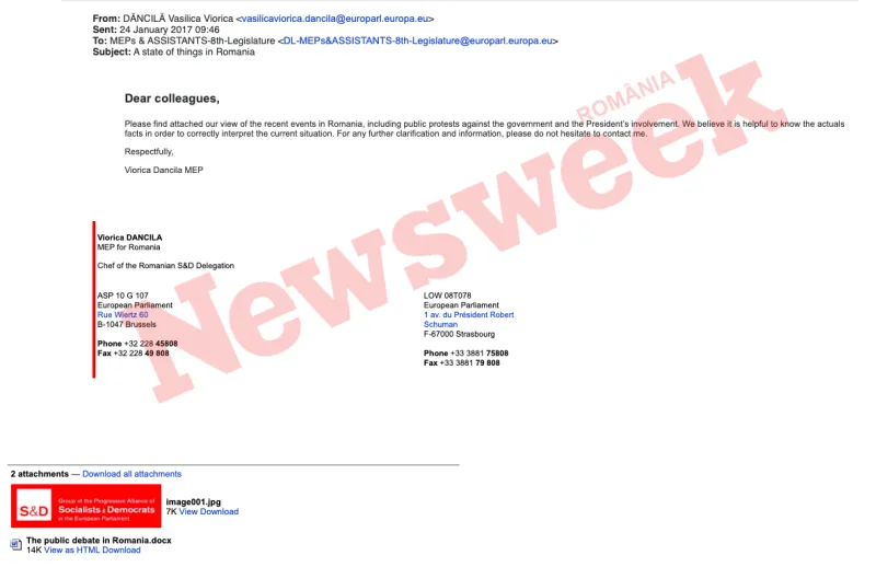 Acesta este contextul foarte tensionat în care Viorica Dăncilă, europarlamentar din partea PSD, decide să acționeze. În ziua celui de-al treilea protest, pe 24 ianuarie, actuala candidată a PSD la prezidențiale le trimite o scrisoare (prin intermediul unui e-mail) colegilor ei europarlamentari.