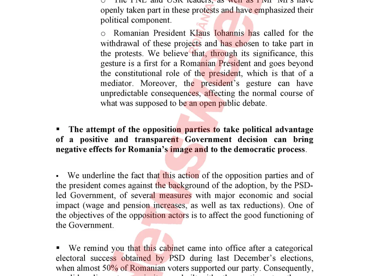 Încercarea partidelor de opoziție de a obține beneficii politice de pe urma unei decizii pozitive și transparente a Guvernului poate să afecteze imaginea României și chiar procesul democratic.