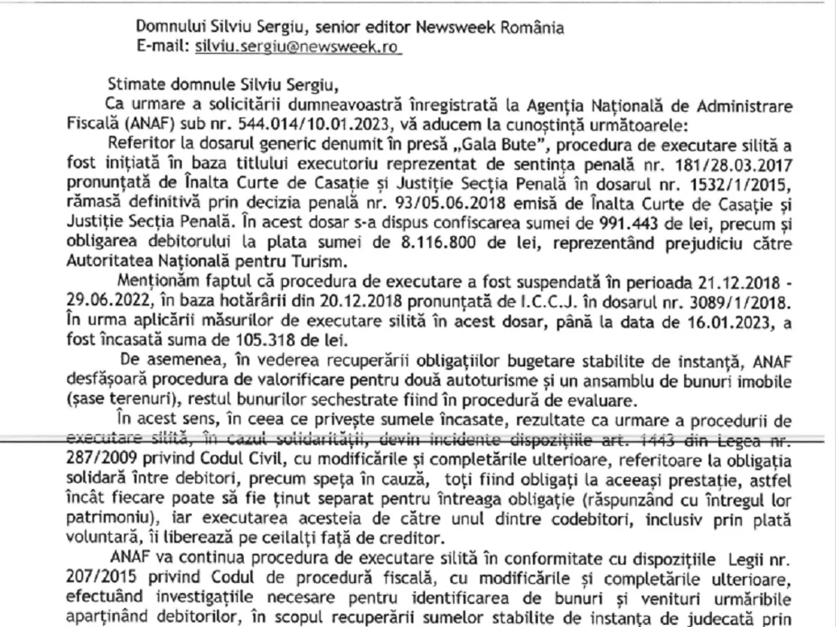 În dosarul Gala Bute „s-a dispus confiscarea sumei de 991.443 lei precum și obligarea debitorului la plata sumei de 8.116.800 lei reprezentând prejudiciu către Autoritatea Națională pentru Turism (...) În urma aplăcării măsurilor de executare silită în acest dosar, până la data de 16 ianuarie 2023, a fost încasată suma de 105.318 lei”, se arată într-un răspuns primit de Newsweek România din partea Agenției Naționale pentru Administrare Fiscală (ANAF).