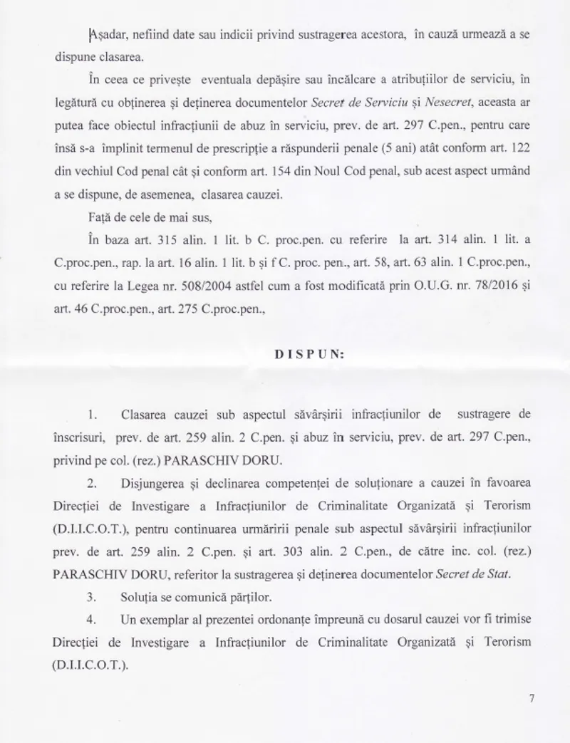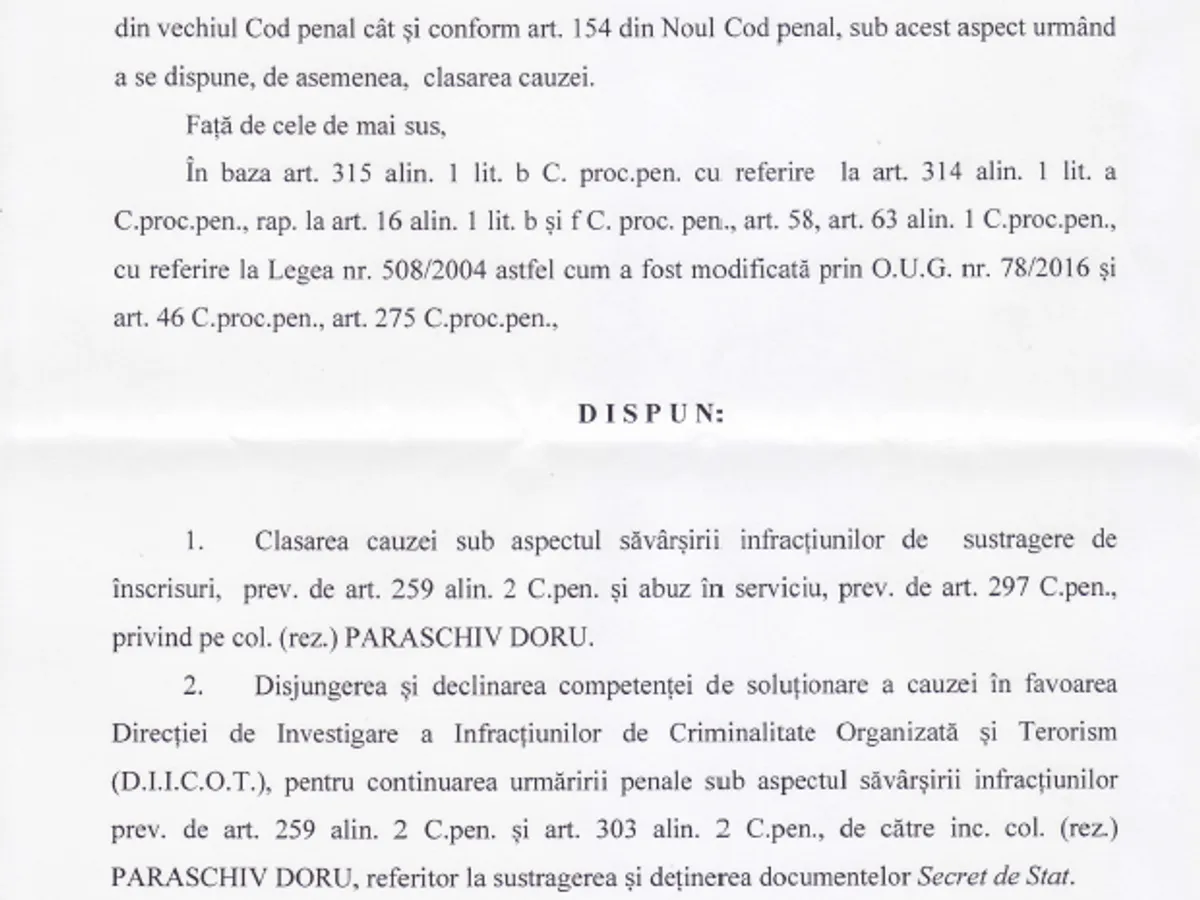 În cele din urmă dosarul a ajuns la DIICOT, așa cum era normal, care, în septembrie 2019, a clasat acuzațiile potrivit cărora Doru Paraschiv ar fi sustras și furnizat către terți informații secrete ale Armatei Române. Rezoluția DIICOT: ”Infracțiunea nu există”.
