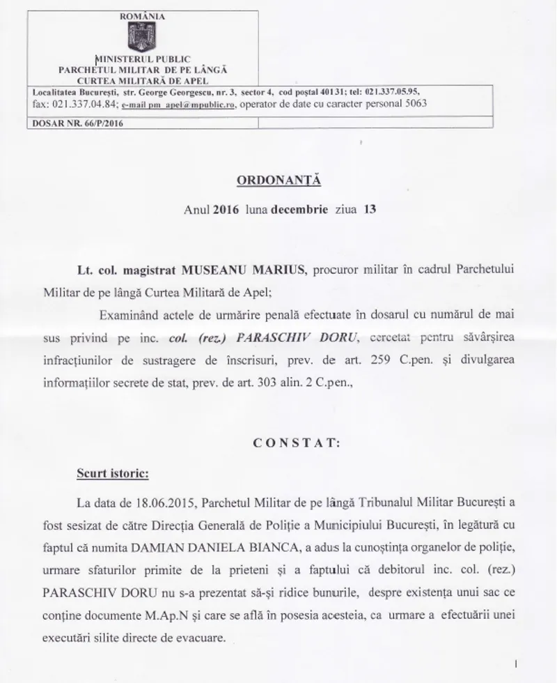 ”L-am cunoscut pe acest procuror cu ocazia anchetei, pe 1 aprilie 2016, când, fără a avea probe, mi-a spus că sunt suspect și, apoi, inculpat. Cred că a făcut asta pentru a mă intimida să renunț la acțiunile mele împotriva grupării Oprea- Hăpău. În orice caz, a făcut asta fără să respecte Codul de Procedură Penală și legislația din domeniul securității militare și naționale, respectiv prevederile Legii 182/2002 și ale HG 585/2002, ambele vizând protecția informațiilor clasificate”, a declarat Newsweek România col. Doru Paraschiv.