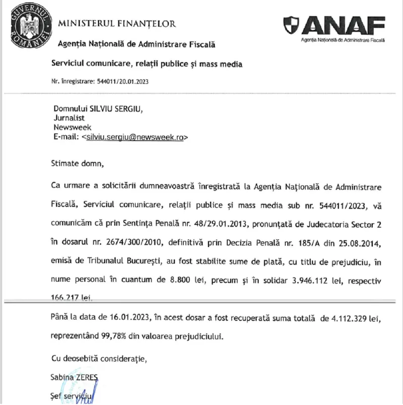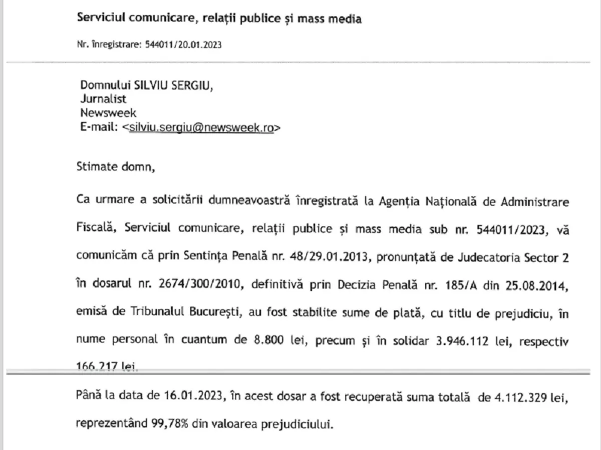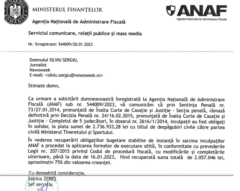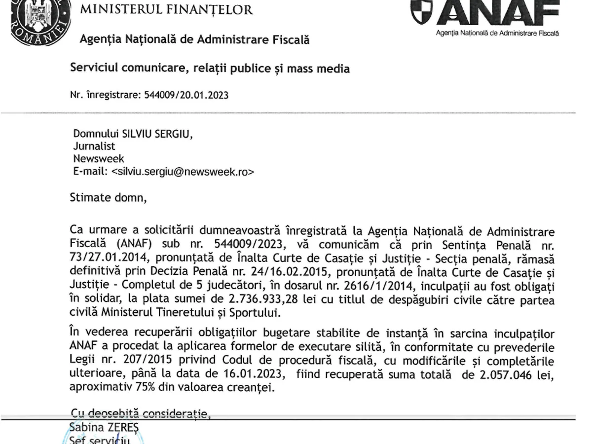 Până la 16 ianuarie 2023, ANAF a reușit să recupereze suma totală de 2.057.046 lei, reprezentând 75% din valoarea prejudiciului stabilit de instanță în Dosarul „Ziua Tineretului”, potrivit informațiilor puse la dispoziția Newsweek România.