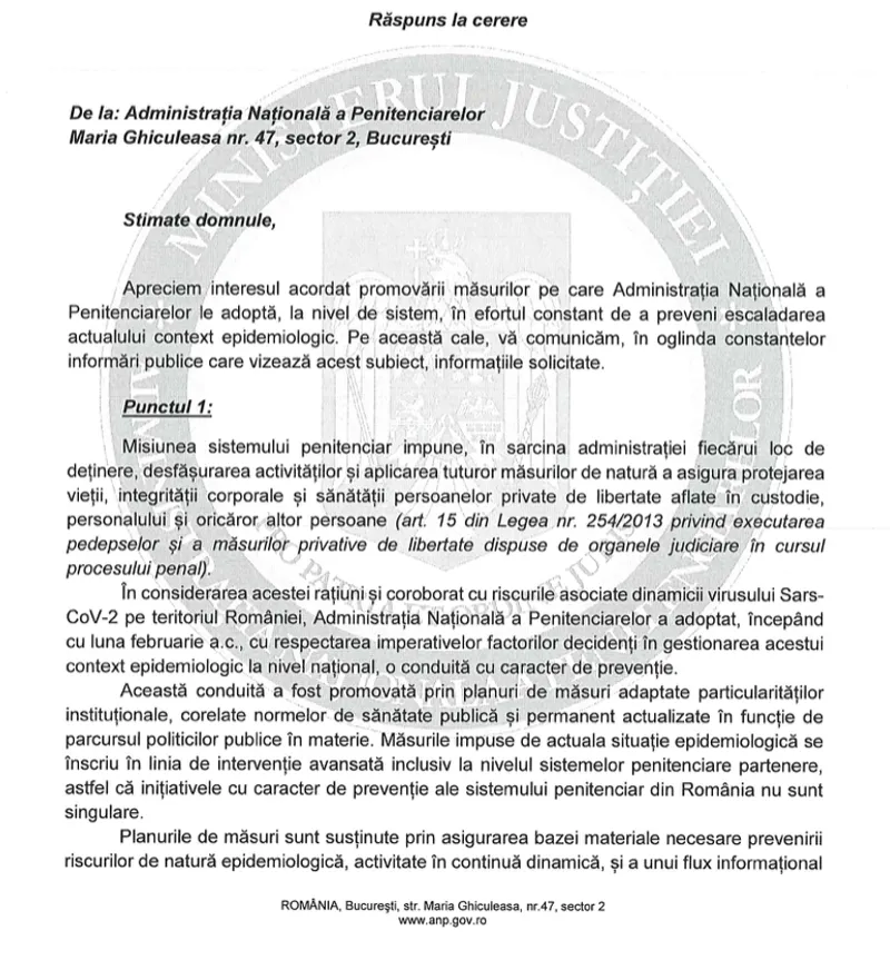 ANP a vrut să evite răspunsul tranșant: "Administrația Națională a Penitenciarelor depune eforturi permanente pentru armonizarea condițiilor de detenție cu legislația specifică națională, internațională și potrivit Convenției Europene a Drepturilor Omului".