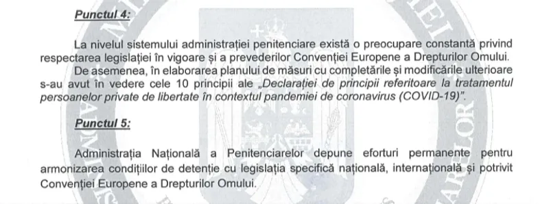 În ce privește respectarea acestor principii raportat la pandemia de coronavirus, Administrația Națională a Penitenciarelor a dat un răspuns fără conținut: „La nivelul sistemului administrației penitenciare există o preocupare constantă privind respectarea legislației în vigoare și a prevederilor CEDO. De asemenea, în elaborarea planului de măsuri (n.r. – prevenirea răspândirii pandemiei) s-au avut în vedere cele 10 principii ale