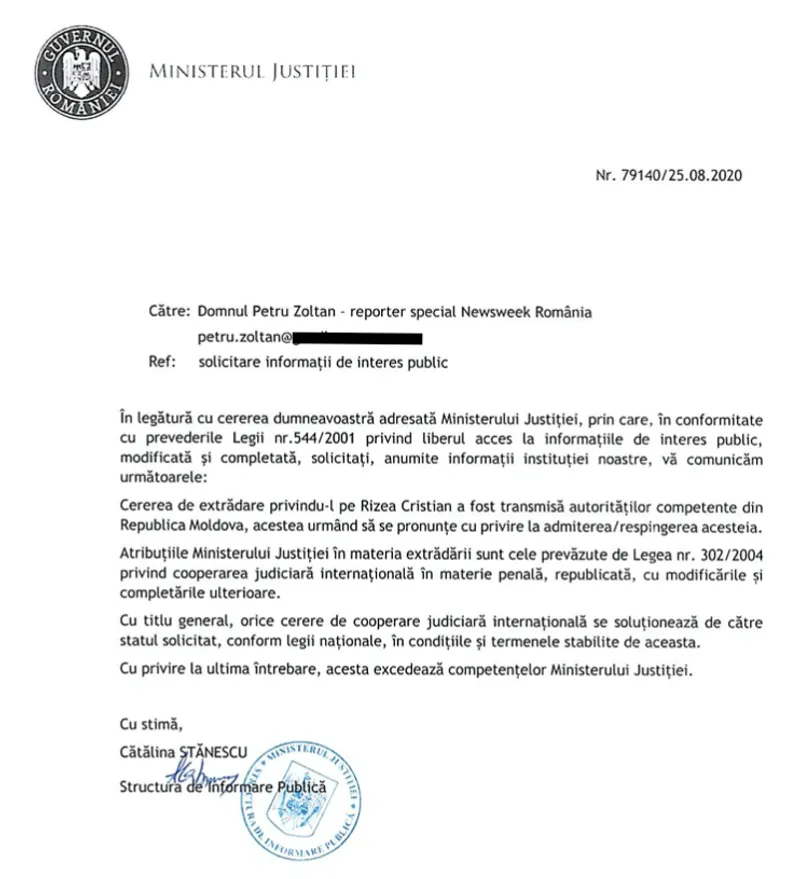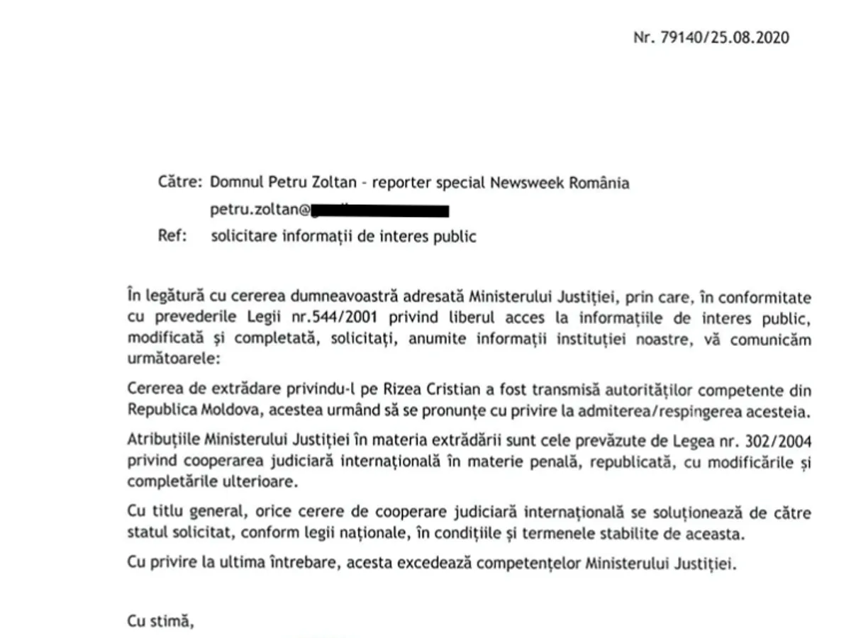 "În consecinţă, astăzi, 04.11.2020, Ministerul Justiţiei din România a procedat în conformitate cu prevederile legale aplicabile, precum şi cu respectarea cadrului juridic multilateral (la nivelul Consiliului Europei - Convenţia Europeană de extrădare din 1957), a întocmit şi transmis o cerere având ca obiect extrădarea cetăţeanului român Cristian Rizea, în vederea punerii în executare a pedepsei de 4 ani şi 8 luni închisoare la care acesta a fost condamnat de către Înalta Curte de Casaţie şi Justiţie. Cererea este însoţită de documentele prevăzute de instrumentul juridic internaţional aplicabil menţionat. Termenele şi modalitatea de soluţionare a cererii sunt supuse legislaţiei statului solicitat, în speţă, legislaţia Republicii Moldova", anunța Ministerul Justiției de la București printr-un comunicat de presă.