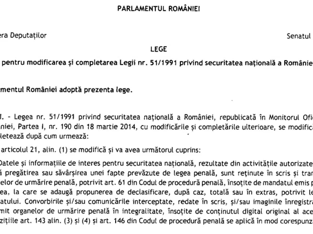 Ministrul Justiției, Cătălin Predoiu, a depus la Camera Deputaților un proiect de modificare a Legii 51/1991 privind siguranța națională a României, prin care informațiile obținute din din interceptările făcute de serviciile secrete pot fi valorificate de polițiști sau procurori.