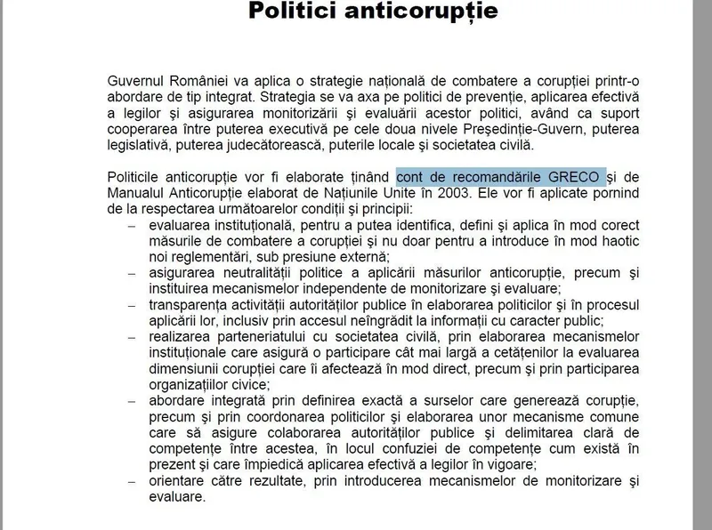 „Guvernul României va aplica o strategie naţională de combatere a corupţiei printr-o abordare de tip integrat. Strategia se va axa pe politici de prevenţie, aplicarea efectivă a legilor şi asigurarea monitorizării şi evaluării acestor politici, având ca suport cooperarea între puterea executivă pe cele doua nivele Preşedinţie-Guvern, puterea legislativă, puterea judecătorească, puterile locale şi societatea civilă.