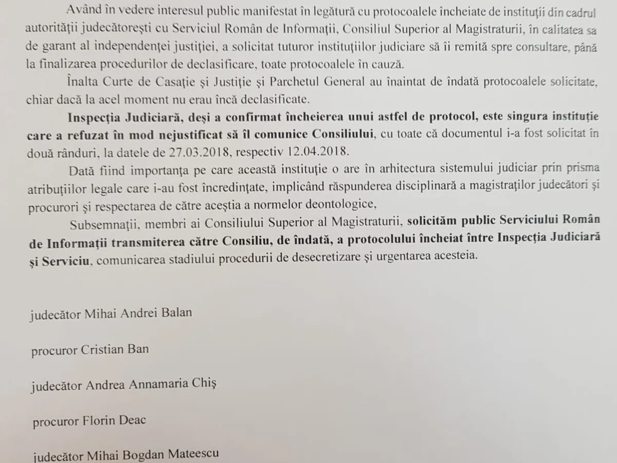 „Dată fiind importanţa pe care această instituţie o are în arhitectura sistemului judiciar prin prisma atribuţiilor legale care i-au fost încredinţate, implicând răspunderea disciplinară a magistraţilor judecători şi procurori şi respectarea de către aceştia a normelor deontologice, subsemnaţii, membri ai Consiliului Superior al Magistraturii, solicităm public Serviciului Român de Informaţii transmiterea către Consiliu, de îndată, a protocolului încheiat între Inspecţia Judiciară şi Serviciu, comunicarea stadiului procedurii de desecretizare şi urgentarea acesteia", se arată în scrisoarea deschisă semnată de judecătorul Mihai Andrei Balan, procurorul Cristian Ban, judecătorul Andrea Annamaria Chiş, procurorul Florin Deac, judecătorul Mihai Bogdan Mateescu, procurorul Nicolae Andrei Solomon şi procurorul Tatiana Toader.