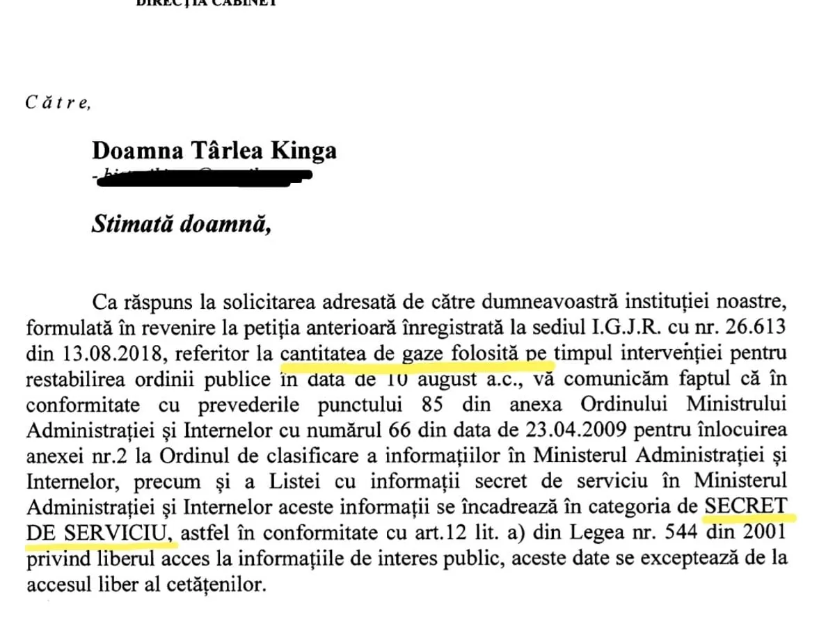 Kinga Târlea, una dintre persoanele care au manifestat pașnic în Piața Victoriei, pe 10 august, a solicitat Jandarmeriei Române să-i comunice, în baza legii privind accesul liber la informații de interes public, care a fost cantitatea de gaze folosită pentru evacuarea protestului.