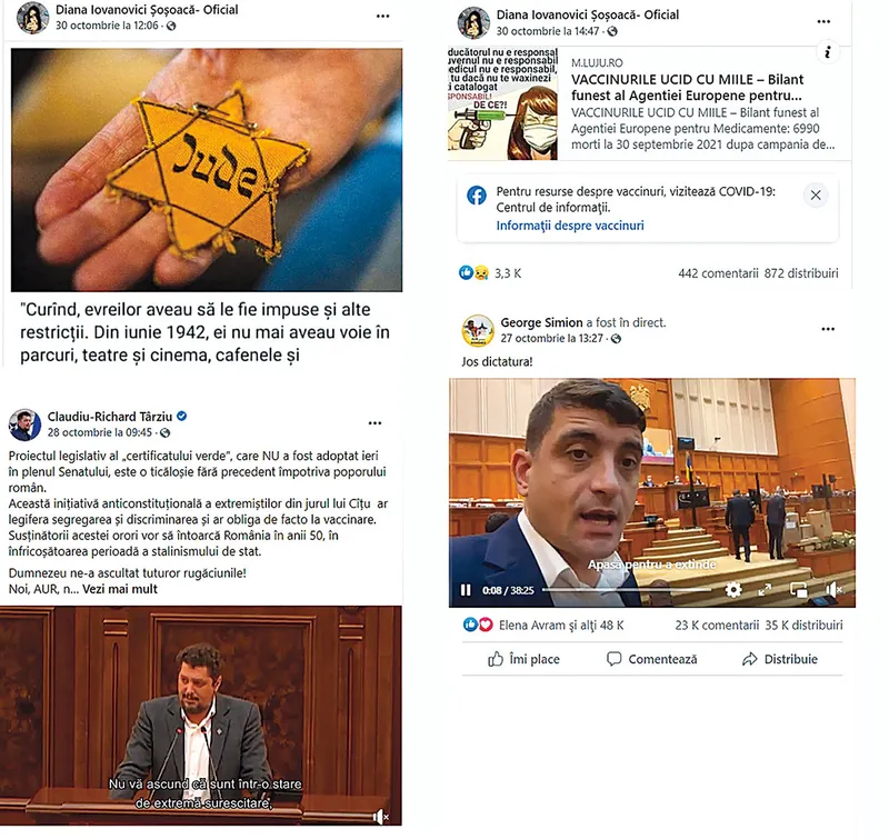 Apoi, conspiraționiștii de pe Facebook își găsesc puternic confirmate teoriile de parlamentarii AUR: din aproape toate intervențiile acestora pe tema pandemiei, a vaccinării și a introducerii certificatului verde este nelipsită „dictatura medicală“ sau, în termenii senatoarei ex-AUR Diana Șoșoacă, „întoarcerea României în epoca hitleristă“.