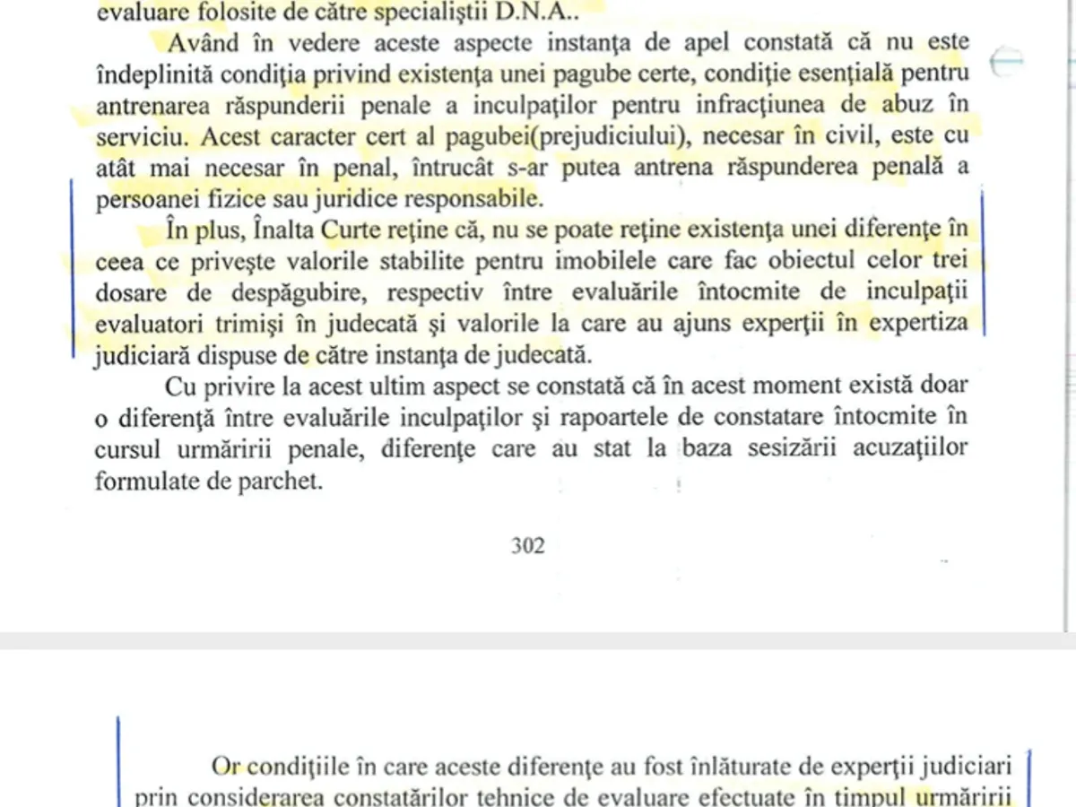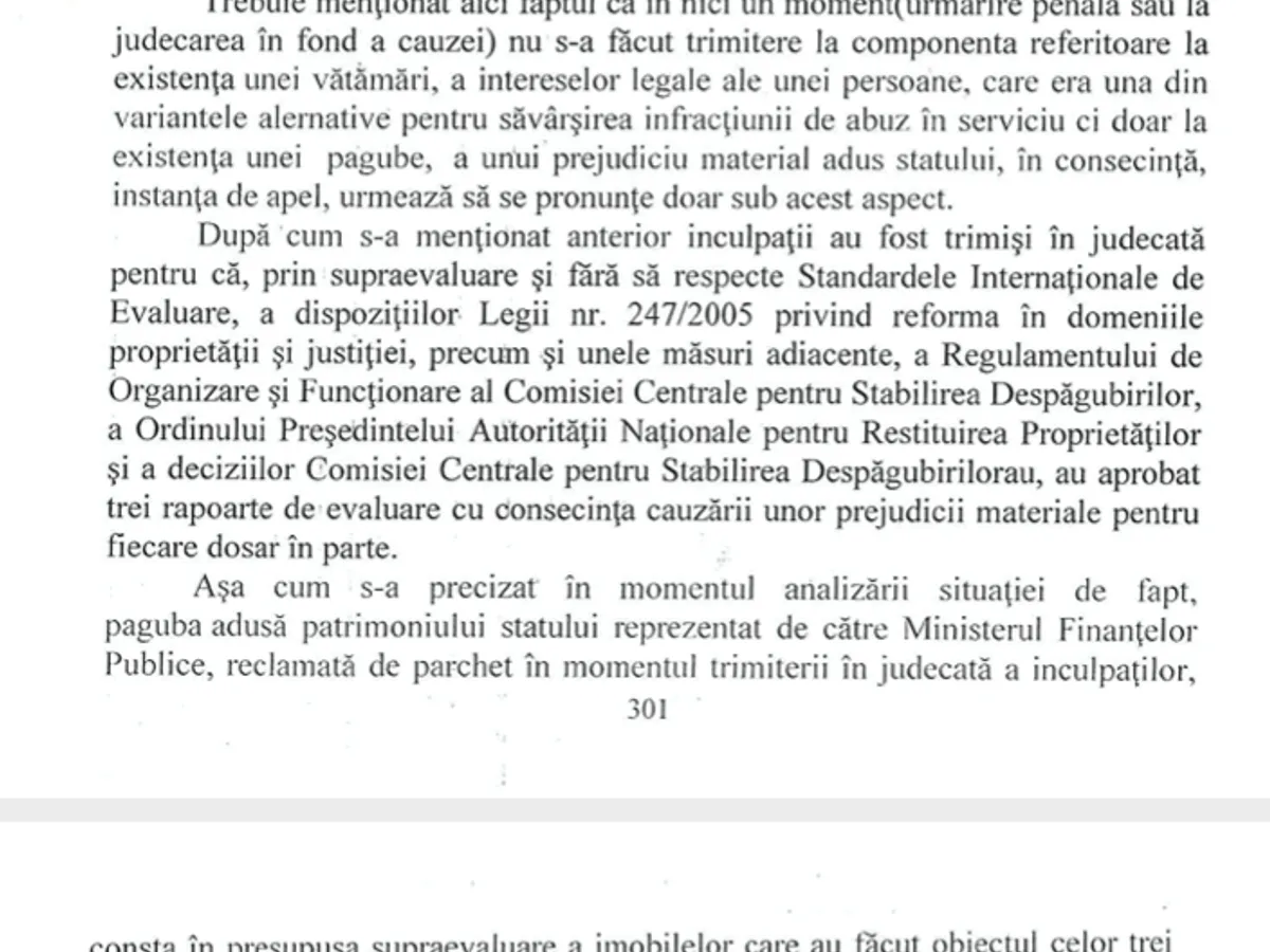 Lovitura de grație este dată prin acest pasaj din motivare: "condițiile în care aceste diferențe (dintre evaluarea experților ANRP și cea a celor de la DNA - n.r.) au fost înlăturate de experții judiciari prin considerarea constatărilor tehnice de evaluare efectuare în timpul urmăririi penale ca fiind nepertinente în ansamblul lor (concluzii însușite atât de către instanța de fond, cât și de Înalta Curte) se constată că nu există o pagubă în sensul prevăzut de lege."