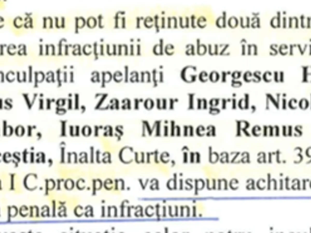 Concis, în final, magistrații au decis: "Având în vedere că nu pot fi reținute două dintre condițiile de tipicitate necesare pentru reținerea infracțiunii de abuz în serviciu pentru care au fost trimiși în judecată inculpații (...), Înalta Curte (...) va dispune achitarea lor întrucât faptele nu sunt prevăzute de legea penală ca infracțiuni."