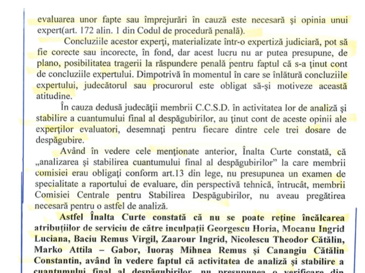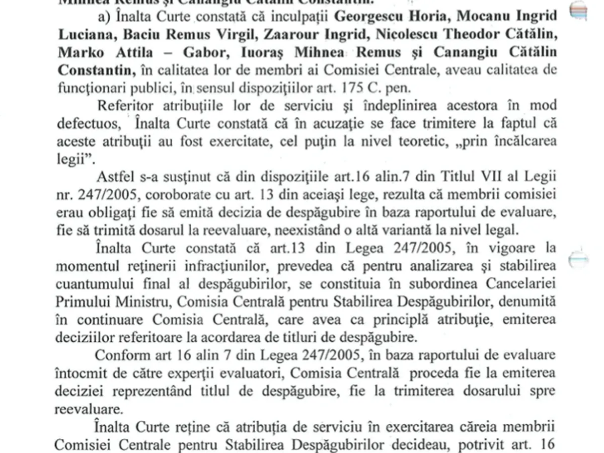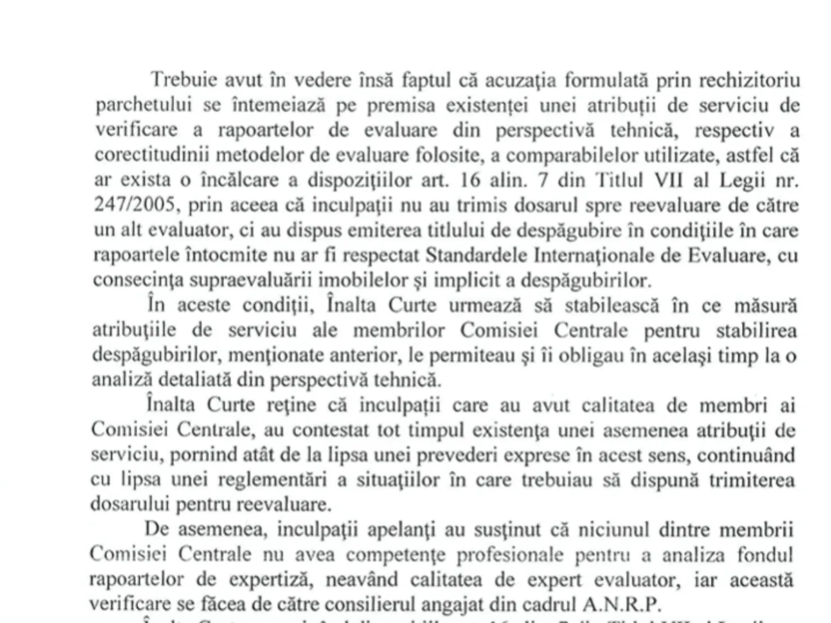 Înalta Curte arată în motivarea deciziei de achitare pentru abuz în serviciu a tuturor inculpaților că "acuzația formulată prin rechizitoriul parchetului se întemeiază pe premisa existenței unei atribuții de serviciu de verificare a rapoartelor de evaluare din perspectivă tehnică". Dar, a adăugat ÎCCJ, "Înalta Curte urmează să stabilească în ce măsură atribuțiile de serviciu ale membrilor Comisiei Centrale pentru Stabilirea Despăgubirilor, menționate anterior, le permiteau și îi obligau în același timp la o analiză detaliată din perspectivă tehnică."
