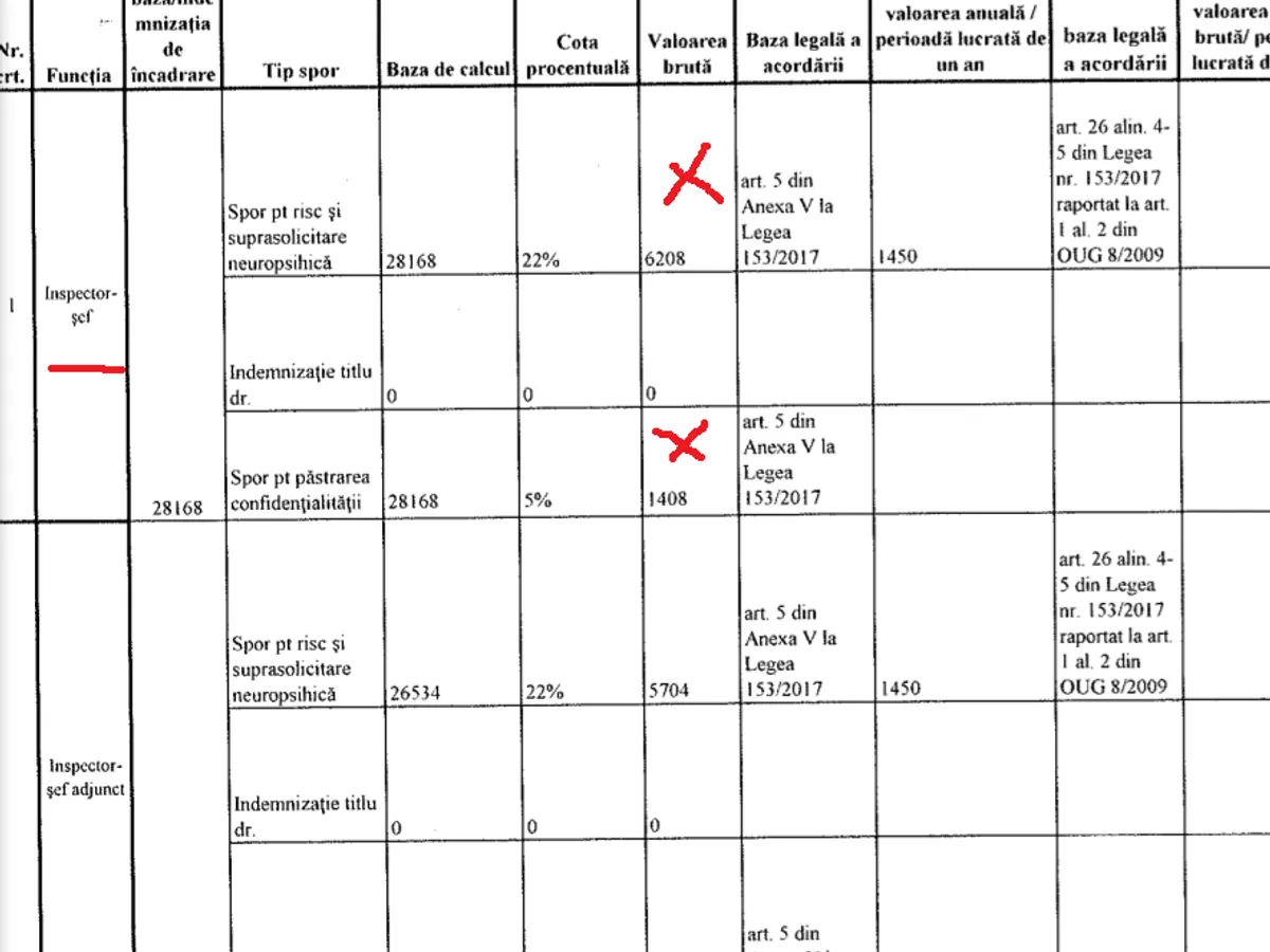 Netejoru încasează un salariu de 28.108 lei. La acesta se adaugă un spor de suprasolicitare neuropsihică de 6.208 lei (echivalentul a 22% din salariu) și un spor de confidențialitate de 1.408 lei (5%).