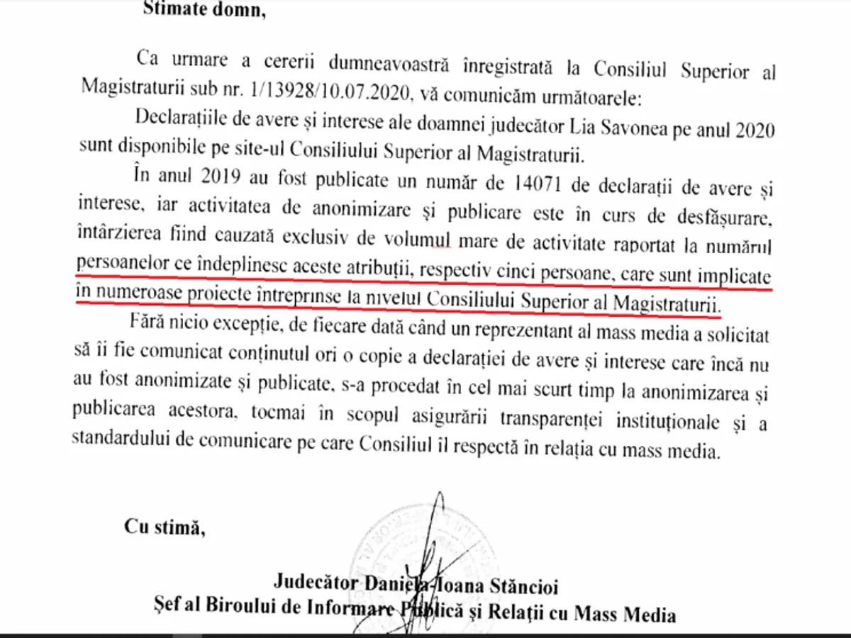 Fără nicio excepție, de fiecare dată când un reprezentant al mass media a solicitat să îi fie comunicat conținutul ori o copie a declarației de avere și interese care încă nu au fost anonimizate și publicate, s-a procedat în cel mai scurt timp la publicarea acestora, tocmai în scopul transparenței instituționale și a standardului de comunicare pe care Consiliul îl respectă în relația cu mass-media.”