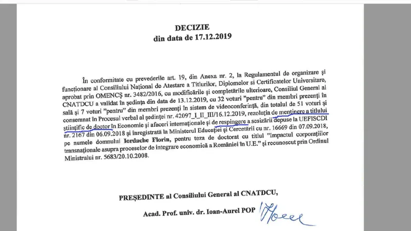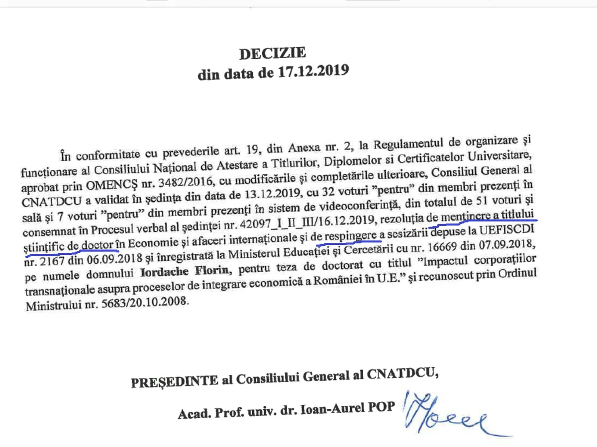 Potrivit Deciziei, „CNATDCU a validat cu 32 de voturi pentru din membri prezenți și 7 voturi pentru din membri prezenți în sistem de videoconferință din totalul de 51 de voturi... rezoluția de menținere a titlului științific de doctor în economie și afaceri internaționale și respingere a sesizării depuse pe numele lui Florin Iordache.”.