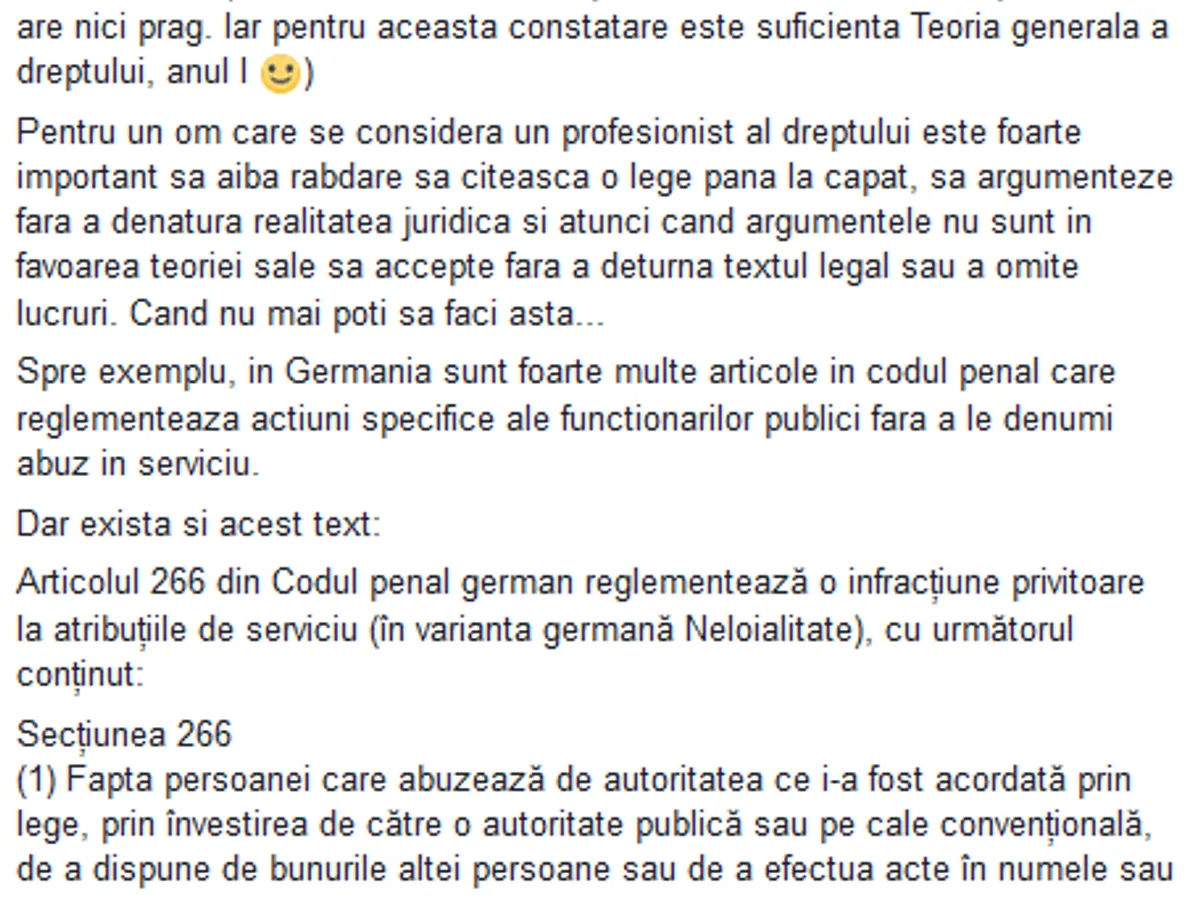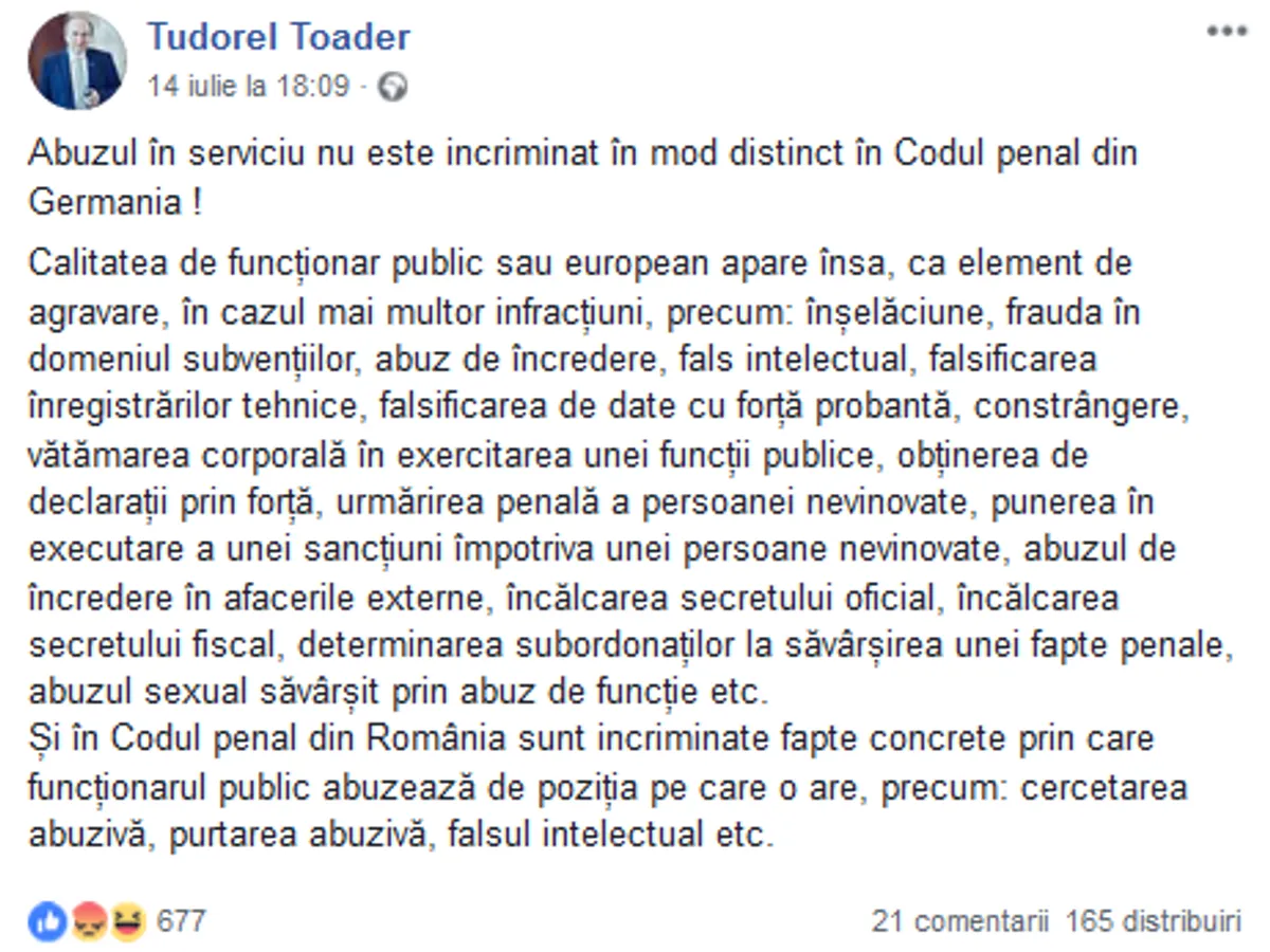 La doar câteva minute după ce Alexandra Lăncrănjan i-a dat replica de la distanţă, Tudorel Toader a revenit pe Facebook cu o contra-replică în care menționa că ”cine vrea si poate, lesne intelege diferentele dintre elementele constitutive ale infractiunilor din art.266 C penal german si art.297 C penal roman.”