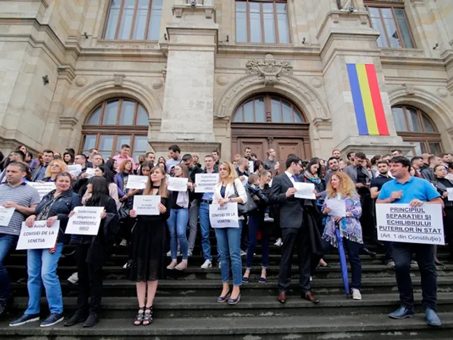 Aproximativ 100 de procurori şi judecători protestează în tăcere, sâmbătă după-amiază, pe treptele Curţii de Apel din Capitală faţă de modificările aduse legilor justiţiei şi faţă de începerea acestui proces legislativ fără obţinerea unui aviz din partea Comisiei de la Veneţia.