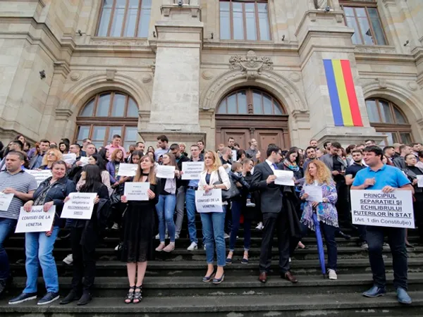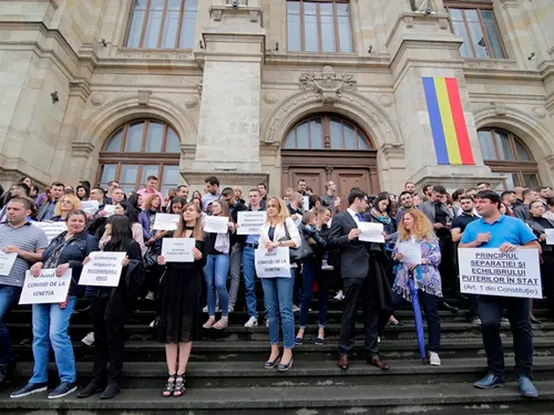 Magistraţii s-au adunat pe treptele Curţii de Apel de la ora 17.00, cu pancarte pe care erau scrise mesaje precum „Pentru o justiţie independentă”, „Avizul Comisiei de la Veneţia”, „Principiul separaţiei şi echilibrului puterilor în stat” sau „Conformarea obligatoriei cu recomandările GRECO”.